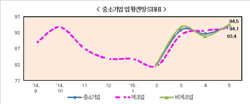 중기중앙회 관계자는 "엔화약세 탓에 수출 실적이 악화했음에도 정부의 잇따른 경기부양책과 5월 연휴중의 내수 활성화 기대감이 반영되면서 반등한 것으로 보인다"고 분석했다.