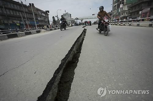 | △ 두 동강 난 네팔 도로 (박타푸르<네팔> EPA=연합뉴스) 26일(현지시간) 네팔 카트만두 인근 박타푸르 지역의 도로가 대지진으로 인해 반으로 갈라져 있다. |