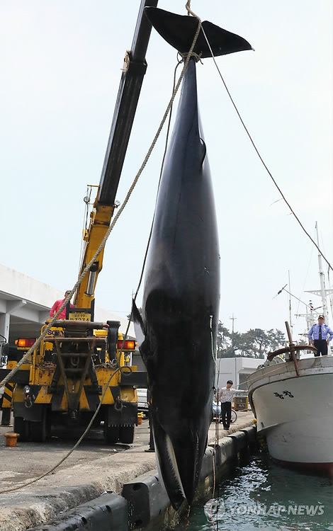 | △ 울산 앞바다서 발견된 작살 박힌 밍크고래 (울산=연합뉴스) 27일 오전 울산시 북구 주전항 동쪽 23㎞ 해상에서 그물에 걸려 죽은 채 발견된 길이 6.3m, 둘레 3.6m의 밍크고래가 동구 방어진항으로 옮겨지고 있다. 울산해양경비안전서는 고래에서 작살로 포획을 시도한 흔적을 발견해 수사에 나섰다. 2015.4.27 << 울산해양경비안전서 >> yongtae@yna.co.kr |