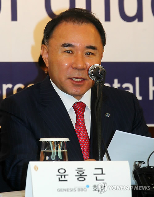| △ (서울=연합뉴스) 최은지 기자 = 윤홍근 제너시스 BBQ회장이 27일 오전 서울 강남구 그랜드인터콘티넨털 호텔에서 열린 레비(Levy)사(社)와의 업무체결에 앞서 발언하고 있다. 이번 체결로 BBQ는 이르면 6월부터 NFL·미 프로야구 메이저리그(MLB)·미 프로농구(NBA)·미 대학스포츠연맹(NCAA) 경기장 92곳과 대학 캠퍼스 125곳의 일반 매장과 무인 매장(키오스크·kiosk) 등에 입점한다. 2015.4.27 chamse@yna.co.kr |