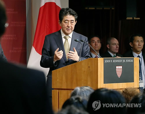 | △ 하버드대서 강연하는 아베 총리 (케임브리지<미국 매사추세츠> 교도=연합뉴스) 아베 신조(安倍晋三) 일본 총리가 27일(현지시간) 미국 하버드대에서 강연하며 학생의 질의에 응하고 있다 . 2015.4.27 sewonlee@yna.co.kr |