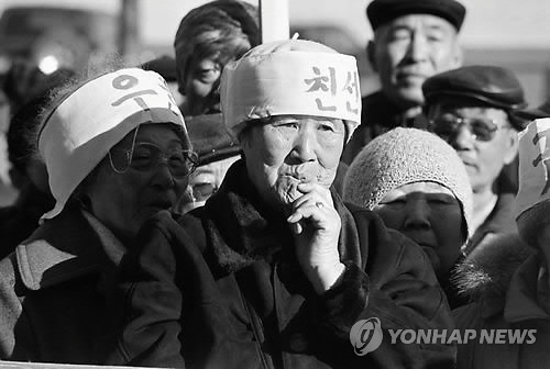 | △ "사할린 강제징용 배상하라" (유즈노사할린스크<러시아>=연합뉴스) 러시아 사할린 유일 한인 신문사인 '새고려신문'의 이예식(65) 기자는 지난 25년간 한인 동포 1세대의 삶을 카메라에 담아왔다. 현지 동포들이 2000년대 초 사할린 일본 총영사관 앞에서 강제징용 배상을 요구하는 시위를 벌이고 있다. 2014.10.15 << 이예식 기자 제공 >> photo@yna.co.kr |
