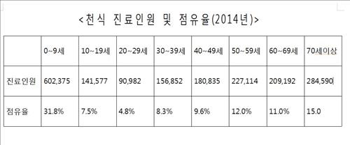 천식 진료 인원이 가장 많은 연령대는 10대 미만이었다. 이 연령대에서 2014년 60만2천명이 진료를 받아 전체의 31.8%를 차지했다.