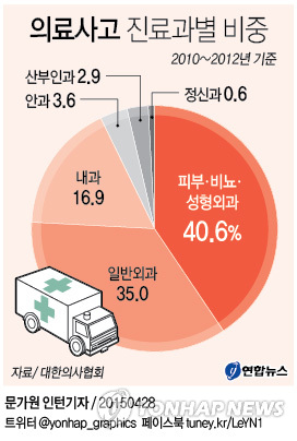 (서울=연합뉴스) 김길원 기자 = 국내 1차 의료기관(병·의원급)에서만 한해 최소 500건 이상의 의료사고가 발생하고, 이 중 40%는 피부·비뇨·성형외과에 집중된 것으로 나타났다.