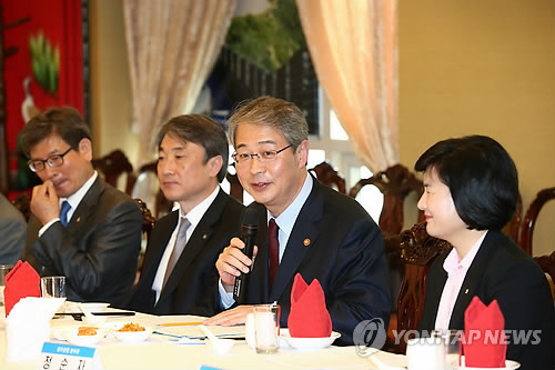 | △ 은행권 준법감시인 간담회 하는 임종룡 금융위원장 (서울=연합뉴스) 임종룡 금융위원장이 28일 서울 여의도 한 식당에서 시중은행의 준법감시인 18명과 가진 현장 간담회에서 인사말을 하고 있다. (금융위 제공) |
