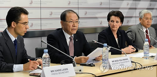 | △ 황우여 사회부총리 '제5차 ASEM 교육장관회의' 기자회견 (서울=연합뉴스) 황우여 사회부총리 겸 교육부 장관이 28일 오전(현지시각) 라트비아 리가 국립도서관에서 열린 '제5차 ASEM 교육장관회의' 기자회견에서 한국의 직업교육 정책 등에 대한 질문에 답하고 있다. (교육부 제공) |