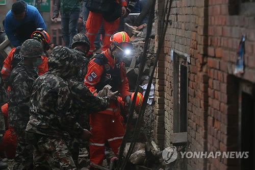 | △ 구조작업 벌이는 119 구조대 (카트만두<네팔>=연합뉴스) 신준희 기자 = 대한민국 중앙 119 구조본부 대원들이 28일 오후(현지시간) 네팔 카트만두 박타푸르 지역에서 구조 작업을 벌이고 있다. 지난 25일 카트만두 북서쪽에서는 진도 7.8 규모의 지진이 발생해 2천명 이상이 사망했으며, 현재까지도 여진이 이어지고 있다. 2015.4.27 hama@yna.co.kr |