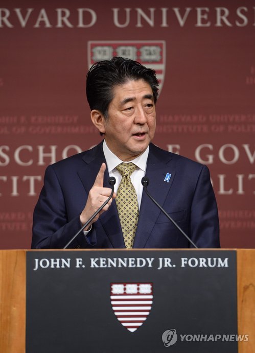 | △ 하버드서 강연하는 아베 총리 (EPA=연합뉴스 자료사진) |