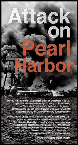 '미국 진주만 폭격을 기억하십니까?'로 시작되는 문안은 일본이 2차 세계대전을 통해 여러 국가에 큰 피해를 줬으며 특히 전 세계의 일본군 위안부에게 아직 사죄와 보상을 하지 않고 있다는 점을 강조했다.