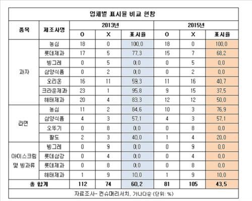 식품 종류별로는 과자류의 가격 표시율이 2013년 77%에서 올해 53.3%로 23.5%포인트나 떨어졌고, 라면도 51.5%에서 45.5%로 6%포인트 하락했다.