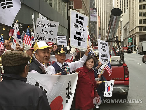 | △ 아베 방미 맞아 샌프란서 일본 역사왜곡 항의 시위 (샌프란시스코=연합뉴스) 임화섭 특파원 = 아베 신조(安倍晋三) 일본 총리가 미국을 방문중인 가운데 28일(현지시간) 낮 미국 샌프란시스코 도심의 일본 영사관 앞에서 중국계·한국계 시민 300여명이 아베 총리의 과거사 부정을 규탄하는 시위를 벌이고 있다. 2015.4.29 solatido@yna.co.kr |