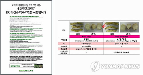 | △ "가짜" vs "진짜"…백수오 진실공방 (서울=연합뉴스) '가짜 백수오' 논란을 둘러싸고 한국소비자원과 백수오 원료 공급 업체인 내츄럴엔도텍 간의 진실공방이 수그러들지 않고 있다. 앞서 소비자원은 내츄럴엔도텍이 식용이 금지된 이엽우피소를 사용했다고 밝혔고, 가짜 백수오 논란에 주가 폭락이라는 직격탄을 맞은 내츄럴엔도텍은 소비자원의 검사 방식에 문제를 제기하며 정면으로 맞선 형국이다. 왼쪽은 27일 종합 일간지에 실린 내츄럴엔도텍의 전면광고, 오른쪽은 한국소비자원에서 배포한 백수오와 이엽우피소를 비교한 자료. |
