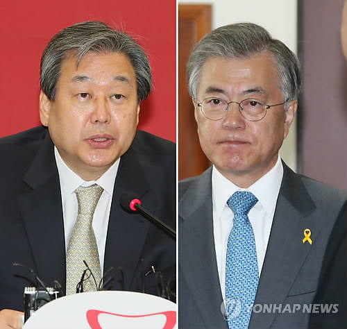 | △ 김무성, 문재인과 첫 대결서 압승 (서울=연합뉴스) 백승렬 이상학 기자 =새누리당 김무성 대표(왼쪽)와 새정치민주연합 문재인 대표가 30일 각각 당회의에 참석했으나 그 표정은 사뭇 달랐다. 선후배 대선후보간 첫 대결은 김무성 대표의 승으로 싱겁게 끝났다. 2015.4.30 srbaek@yna.co.kr leesh@yna.co.kr |