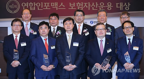 | △ 제1회 연합인포맥스 보험자산운용 대상 시상식 (서울=연합뉴스) 김도훈 기자 = 30일 오전 서울 중구 롯데호텔에서 열린 제1회 연합인포맥스 보험자산운용 대상 시상식에서 수상자 및 시상자들이 기념촬영을 하고 있다. 앞줄 왼쪽부터 알리안츠생명 박대양 실장, 삼성생명 전영묵 전무, 삼성화재 박인성 본부장, 동부화재 정경수 부사장, 신한생명 김무하 상무, 뒷줄 왼쪽부터 손해보험협회 장남식 회장, 연합인포맥스 이선근 사장, 진웅섭 금융감독원장, 생명보험협회 이수창 회장, 연합인포맥스 이상인 전무. 이날 시상식에서 삼성화재가 대상을, 동부화재가 손해보험 최우수상, 삼성생명이 생명보험 최우수상, 신한생명이 리스크관리상, 알리안츠생명이 혁신상을 각각 수상했다. |