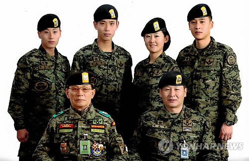| △ 우리는 특전사 대가족 (서울=연합뉴스) 이영재 기자 = 3대가 내리 특전사에 몸을 담고 조카와 며느리까지 특전사의 검은 베레모를 쓴 김도형(49) 원사(앞줄 오른쪽)의 가족사진. 앞줄 왼쪽은 김 원사의 부친 예비역 상사 김기철(80)씨. 뒷줄 왼쪽부터 김 원사의 아들 김승엽 중사, 조카 김형섭 중사, 며느리 정명희 중사, 아들 김우엽 중사. 2015.4.30 << 육군 제공 >> ljglory@yna.co.kr |