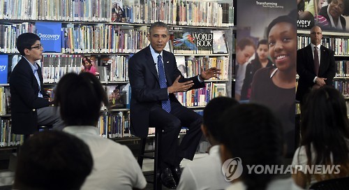 | △ 오바마 대통령, 중학생들과 대화(AP=연합뉴스) |