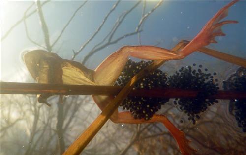 | △ 연못 표면에 알을 낳는 송장개구리. 양서류는 전체 종 가운데 12.9%가 지구온난화로 멸종위험을 맞을 것으로 전망돼 기후변화 영향을 가장 크게 받는 생물로 나타났다. 코네티컷대학 마크 어번 교수 제공. |