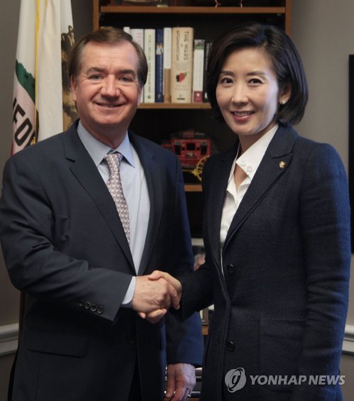 | △ (워싱턴=연합뉴스) 심인성 특파원 = 미국 하원 외교 사령탑인 에드 로이스(공화·캘리포니아) 하원 외교위원장과 나경원 국회 외통위원장이 30일(현지시간) 미 연방의회 레이번빌딩에서 만나 아베 신조 일본 총리의 과거사 부정에 대해 "매우 실망스럽다"고 한목소리로 비판했다. 2015.5.1 sims@yna.co.kr |