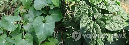 | △ 제주산 백수오와 이엽우피소 잎의 차이 (제주=연합뉴스) 왼쪽은 백수오 잎으로 단면이 매끄러우며, 오른쪽은 이엽우피소 잎으로 단면이 거칠다.<< 제주도 농업기술원 제공 >> |