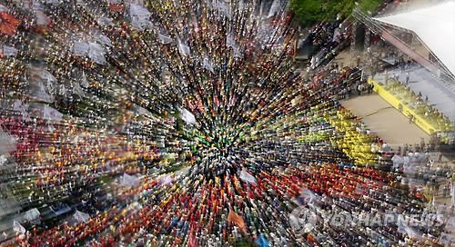 | △ 근로자의 날, 한자리에 모인 민주노총 (서울=연합뉴스) 홍해인 기자 = 근로자의 날인 1일 서울 중구 서울시청 앞 광장에서 세계노동절대회가 열려 참석자들이 구호를 외치고 있다. 2015.5.1 hihong@yna.co.kr |