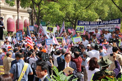 이날 시위에는 한·중·일 시민단체들을 비롯해 히스패닉계, 미국 시민단체까지 가세했다. 시위가 열린 퍼싱 스퀘어 공원에는 태극기와 성조기, 오성홍기가 나부꼈다.