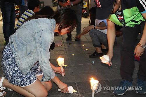 | △ "동포들 무사하길" 네팔인들의 '간절한 기도' (수원=연합뉴스) 2일 오후 7시 경기도 수원시 팔달구 수원역 광장에서 경기서남부지역에 거주하는 네팔인 70여명이 모여 지진 희생자를 추모하는 촛불문화제를 열었다. 한 네팔인이 'Pray for Nepal'란 글귀를 만들기 위해 초를 세우고 있다.2015.5.2<<수원시외국인복지센터>> goals@yna.co.kr |