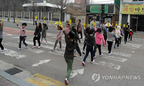 | △ 교통안전교육에 참가한 어린이들이 안전하게 횡단보도를 건너는 방법을 익히고 있다. (연합뉴스 자료사진) |