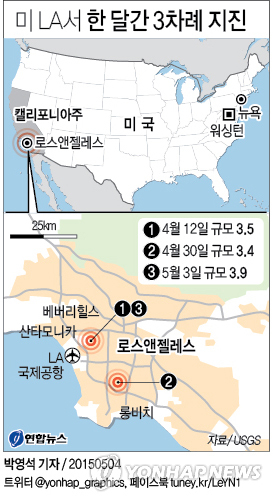 (로스앤젤레스=연합뉴스) 김종우 특파원 = 미국 캘리포니아 주 로스앤젤레스(LA)에서 한 달간 규모 3.0 이상 지진이 3차례 발생하면서 LA 주민들이 불안해하고 있다.