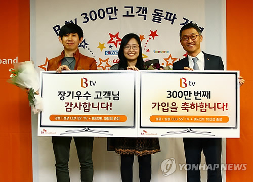 | △ SK브로드밴드 B tv, 300만 가입자 달성 (서울=연합뉴스) SK브로드밴드는 IPTV 'B tv'가 가입자 300만명을 달성했다고 25일 밝혔다. 장기우수고객 한완규 씨(왼쪽부터), 300만번째 가입자 조현정 씨가 이인찬 SK브로드밴드 사장과 기념촬영을 하고 있다. 2015.3.25 << SK브로드밴드 제공 >> photo@yna.co.kr |