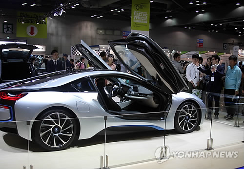 | △ 멋진 전기자동차 모델 (고양=연합뉴스) 우영식 기자 = 3일 경기도 고양시 킨텍스에서 열린 '세계 전기자동차 학술대회 및 전시회'에서 참관객들이 한 업체에서 출시한 전기자동차 모델을 살펴보고 있다. |
