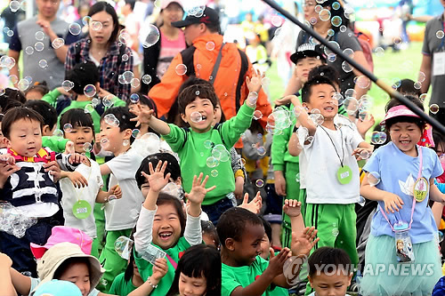 | △ 환호하는 아이들 (서울=연합뉴스) 김수진 기자 = 어린이날을 하루 앞둔 4일 오전 서울 마포구 월드컵공원 난지잔디광장에서 열린 2015 마포어린이축제 '마포둥이 모여라'에 참가한 어린이들이 비누방울을 보며 즐거워 하고 있다. ksujin@yna.co.kr |