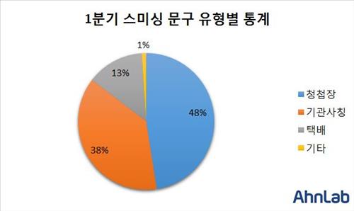 올해 1분기 수집된 스미싱 악성코드는 모바일 청첩장, 기관 사칭, 택배 사칭 등 고전적인 문구를 이용한 경우가 전체의 98.9%로 대부분을 차지했다.