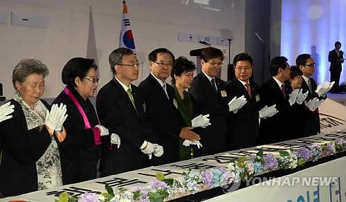 | △ 케이블TV 20주년 기념식 축하 떡 절단 (서울=연합뉴스) 도광환 기자 = 박근혜 대통령이 13일 오전 서울 동대문디자인플라자(DDP)에서 열린 제20주년 케이블TV의 날 기념식에서 축하 떡을 자른 뒤 박수치고 있다. 왼쪽부터 김천주 한국여성소비자연합회장, 김을동 의원, 최성준 방송통신위원장, 양휘부 한국케이블TV빙송협회장, 박 대통령, 최양희 미래창조과학부 장관, 홍문종 의원, 전병헌 의원, 민병주 의원, 김종 문화체육관광부 차관. 2015.3.13 dohh@yna.co.kr |