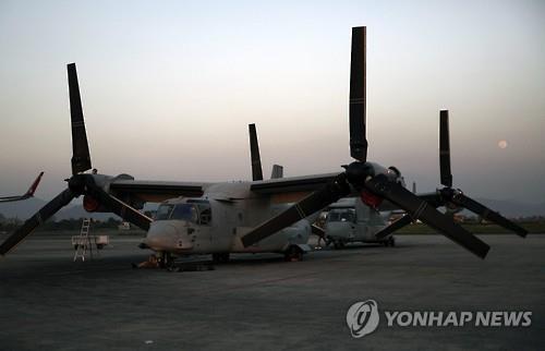 | △ 3일(현지시간) 네팔 카트만두 트리부반 공항에 도착한 미국 해병대 V-22 오스프리 수직이착륙 수송기(EPA=연합뉴스) |
