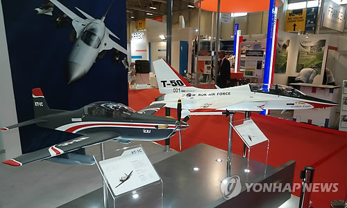 | △ 터키 국제방산전시회의 한국 훈련기 모형 (이스탄불 국방부공동취재단=연합뉴스) 5일(현지시간) 터키 이스탄불에서 개막한 2015 국제방위산업전시회(IDEF)에 한국항공우주산업(KAI)의 훈련기 T-50과 KT-1C 모형이 전시돼 있다. 2015.5.5 photo@yna.co.kr |