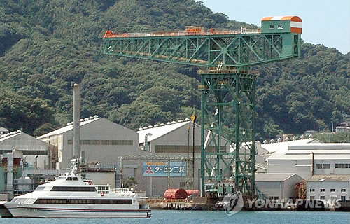 | △ '조선인 강제징용' 일본산업시설 세계유산 등록 유력 (도쿄 교도=연합뉴스) 조선인 강제징용의 한이 서린 일본 산업시설의 유네스코 세계유산 등록이 유력해졌다. 일본 정부는 2014년 1월 후쿠오카(福岡)현 기타큐슈(北九州)의 야하타(八幡)제철소, 나가사키(長崎)현의 나가사키 조선소(미쓰비시 중공업) 등 현재 가동 중인 시설과 미쓰비시 해저 탄광이 있던 하시마(端島.일명 '군함도') 등 총 23개 시설을 산업유산으로 등재 신청했다. 이 가운데는 과거 5만7천900명의 조선인이 강제징용된 7개 시설이 포함돼 있다. 사진은 나가사키(長崎)현의 나가사키 조선소(미쓰비시 중공업). 2015.5.4 |
