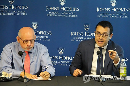 | △ (워싱턴=연합뉴스) 심인성 특파원 = 미국 싱크탱크 신안보센터의 밴 잭슨 객원연구원(오른쪽)이 5일(현지시간) 워싱턴DC의 존스홉킨스대 국제관계대학원(SAIS) 한미연구소 강당에서 열린 조찬간담회에서 북한 문제에 대해 언급하고 있다. 북한전문 웹사이트인 '38노스' 운영자인 조엘 위트 SAIS 연구원 주관으로 열린 간담회에서 잭슨 연구원은 김정은 북한 국방위원회 제1위원장이 모스크바에서 열리는 제2차 세계대전 승전 기념식에 참석하지 않기로 한 것은 "국내가 불안해서 러시아 방문길에 나서지 못하는 것"이라고 분석했다. 왼쪽은 조엘 위트. 2015.5.6 sims@yna.co.kr |