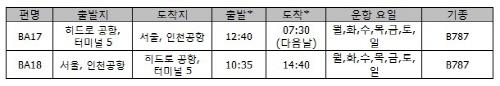영국항공은 2012년 12월부터 한국에 취항해 서울 인천∼런던 히드로 직항 노선을 주 6회 운항하다 2014년 3월31일부터는 주 7회로 증편해 매일 운항하고 있다.