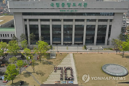 | △ 국립중앙도서관, '천만장서 달성 및 개관 70주년' (서울=연합뉴스) 23일 서울 서초구 국립중앙도서관 앞 잔디마당에서 직원들이 오는 5월 '천만장서 달성 및 개관 70주년 기념식'에 앞서 '천만장서, 당신의 힘입니다' 슬로건을 들고 기념촬영을 하고 있다. (국립중앙도서관 제공) |