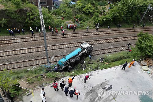 | △ 경부선 덮친 탱크로리 차량 (부산=연합뉴스) 조정호 기자 = 6일 오전 부산시 사상구 주례동 보훈병원 맞은편에서 정화조 청소용 탱크로리 차량이 주차 차량 2대를 들이받고 경부선 철길로 추락했다. 이 사고로 경부선 상행선 열차 운행이 중지됐다. 2015.5.6 ccho@yna.co.kr |