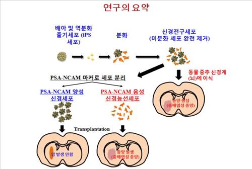 연세대의대 김동욱 교수팀(줄기세포기반 신약개발연구단 단장)은 6일 인간 다능성 줄기세포(hPSC)로 만든 신경계 전구세포(NPC)가 종양을 일으키는 원인을 규명하고 원인물질을 제거해 암을 유발하지 않도록 하는 동물실험에 성공했다고 밝혔다.