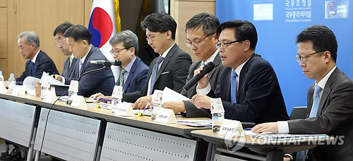 | △ 규제개혁 관련 정부 합동 사전 브리핑 (세종=연합뉴스) 배재만 기자 = 권평오 산업통상자원부 무역투자실장(오른쪽에서 두 번째)을 비롯한 정부 관계부처 담당자들이 정부세종청사 1동 브리핑룸에서 규제개혁장관회의와 관련한 사전 브리핑을 열고 있다. 왼쪽부터 강봉한 식품의약품안전처 의료기기안전국장, 맹성규 국토교통부 교통물류실장, 정병윤 국토교통부 국토도시실장, 강영철 국무조정실 규제조정실장, 이정원 국무조정실 규제혁신기획관, 강성주 미래창조과학부 인터넷융합정책관, 권평오 산업통상자원부 무역투자실장, 정지원 금융위원회 상임위원. |