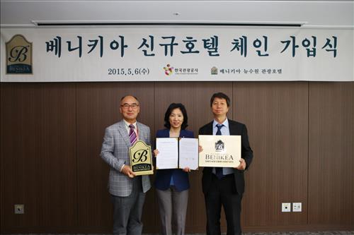 (서울=연합뉴스) 전준상 기자 = 우리나라 토종 비즈니스호텔체인 브랜드 '베니키아'를 운영 중인 한국관광공사는 6일 뉴수원 관광호텔과 베니키아 호텔체인 가맹계약을 맺었다.