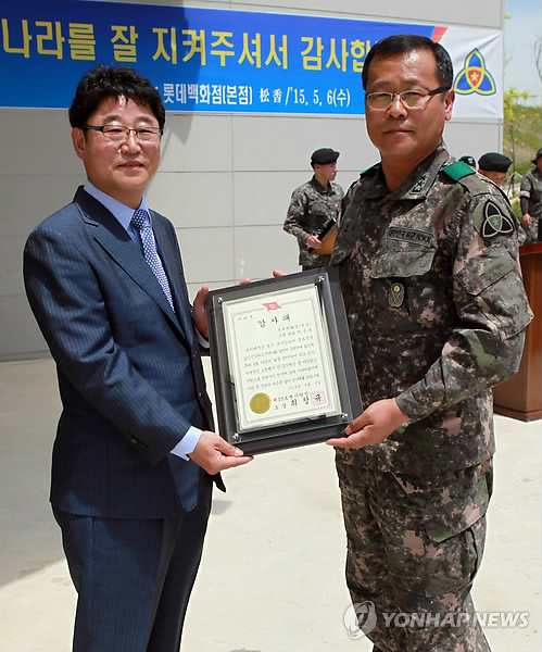 | △ 군인 2천명에 중국음식 대접한 박송도씨 (임실=연합뉴스) 서울에서 중국 음식점을 운영하는 박송도 대표는 6일 임실군에 있는 육군35사단을 찾아 장병 2천명에게 잡채밥과 탕수육을 대접하는 봉사를 펼쳤다. 그는 식당을 운영하면서 수익의 3%를 봉사기금으로 마련해 1년에 네차례 노인과 장애인, 군인 등을 위해 사용하고 있다. 사진은 최창규 사단장(오른쪽)에게 감사패 받는 박 대표. 2015.5.6 <<육군35사단>> chinakim@yna.co.kr |