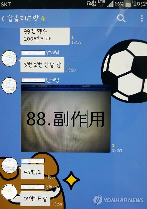 | △ 한자능력시험 부정행위에 악용된 카톡방 (부산=연합뉴스) 6일 부산 금정경찰서가 공개한 부산지역 대학 4곳 학군단 한자능력시험에서 부정행위 수단으로 악용된 카톡방. 2015.5.6 << 부산 금정경찰서 >> osh9981@yna.co.kr |