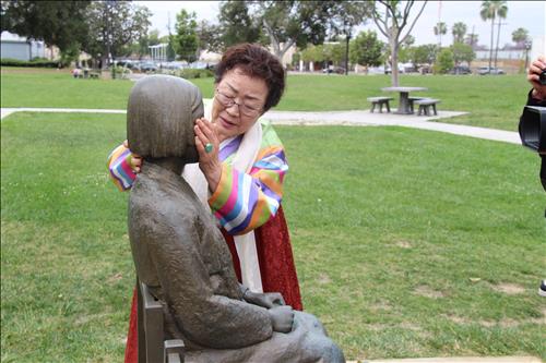 일본군 위안부 피해자 이용수(87) 할머니가 6일(현지시간) 미국 캘리포니아 주 글렌데일 시립공원에 세워진 '평화의 소녀상'을 찾아 아베 신조(安倍晋三) 총리의 역사 부정을 추상같이 꾸짖었다.