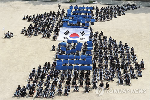 | △ 운동장에 펼쳐진 한반도 (서울=연합뉴스) 박정헌 기자 = 7일 오전 서울 강북구 화계중학교에서 학생들이 한반도 형상 안에 '통일' 두 글자를 만드는 플래시몹을 하고 있다. 2015.5.7 home1223@yna.co.kr |