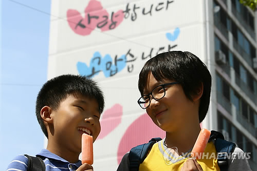| △ '사랑합니다 고맙습니다' (대구=연합뉴스) 김준범 기자 = 어버이날을 하루 앞둔 7일 오후 외벽에 '아빠, 엄마 사랑합니다 고맙습니다'의 문구가 적힌 대구 서구 원대동의 한 아파트 앞을 어린이들이 지나고 있다. 2015.5.7 psykims@yna.co.kr |
