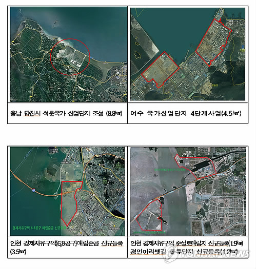 지난 한 해 충남 당진시 석문국가 산업단지(8.8㎢), 여수 국가산업단지 부지(4.5㎢), 인천 경제자유구역 6·8 공구(3.5㎢)와 준설토매립지(1.9㎢), 경인아라뱃길 물류단지(1.2㎢) 등이 새로 조성돼 국토 면적에 포함됐다.