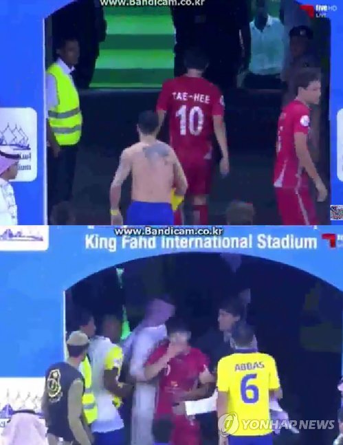 | △ 알 나스르 선수에 폭행당하는 남태희 (서울=연합뉴스) 카타르 축구리그 레퀴야에서 뛰는 남태희가 7일(한국시간) 사우디아라비아 리야드의 킹 파드 스타디움에서 열린 아시아축구연맹(AFC) 챔피언스리그 알 나스르와 경기에서 상대 선수인 파비안 에스토야노프에게 폭행당했다. 사진 위쪽은 에스토야노프가 남태희를 따라가는 모습이고, 아래쪽은 폭행당한 남태희가 얼굴을 감싸쥐는 모습이다. 2015.5.7 << 유튜브 영상 캡처 >> photo@yna.co.kr |